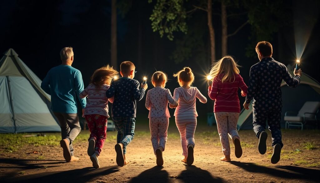 Games like scavenger hunts, campfire stories, and nature Olympics are great for families. They bring excitement to your camping trips. They also help you work together, think creatively, and love nature more.
