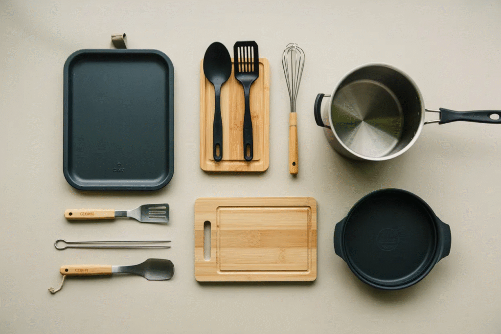 Visible cookware includes a heavy-duty pot, likely cast iron or enameled, along with utensils such as spatulas, a whisk, skewers, and cutting boards. This combination suggests versatility. You can cook simple meals quickly or take more time when the day allows.