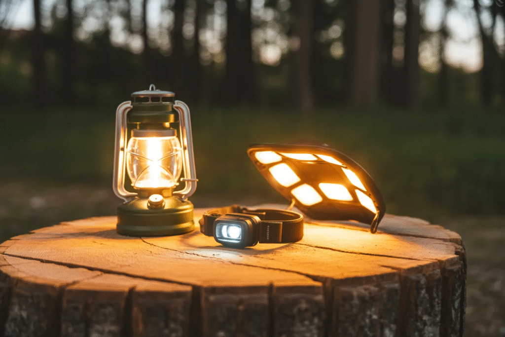 Lighting appears multiple times in the image, which reflects its importance. There are lantern-style lights, compact lamps, and ambient light sources. This variety supports different needs at camp.