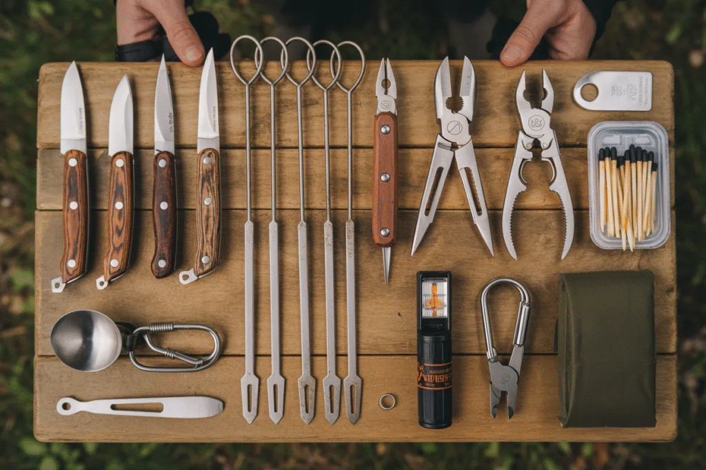 Scattered throughout the image are small tools and accessories: knives, skewers, clips, and multi-purpose items. These are the unsung heroes of car camping.