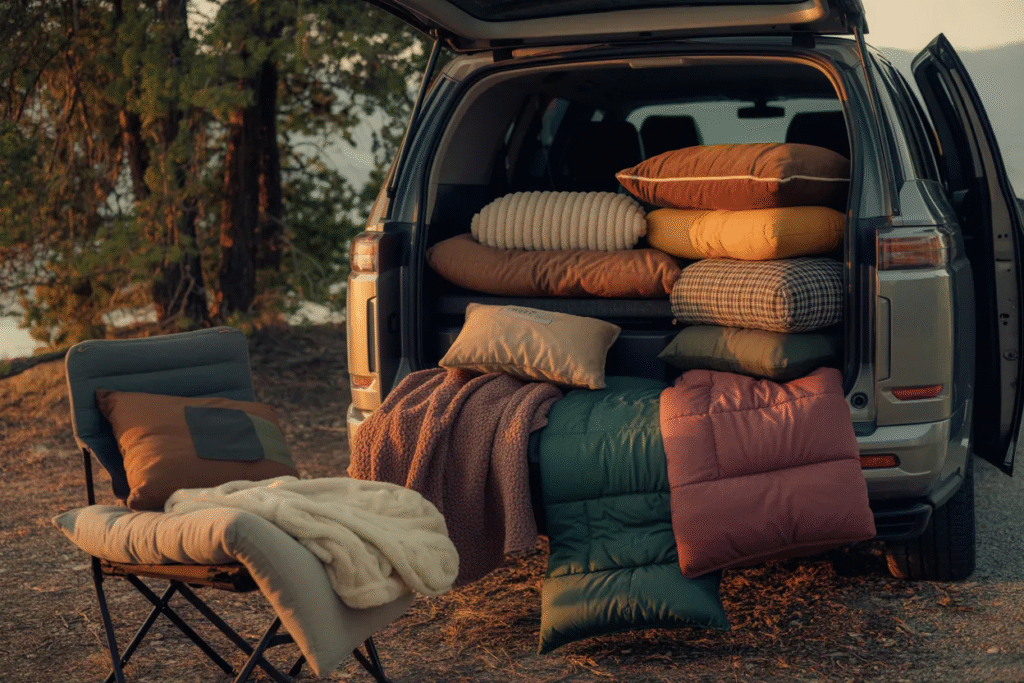 Surrounding the tent are clear sleep-related items: sleeping pads, folded bedding, pillows, and soft textiles. This shows a focus on rest rather than endurance. Long road trips are physically demanding. You’re driving for hours, setting up camp repeatedly, and adjusting to new environments constantly. A poor sleep setup compounds fatigue quickly.